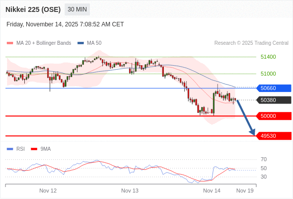 交易策略: 在 50660 之下,看跌,目标价位为 50000 ,然后为 49530 。