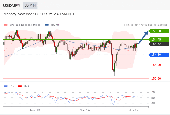 在 154.30 之上,看涨,目标价位为 154.75 ,然后为 155.00 。