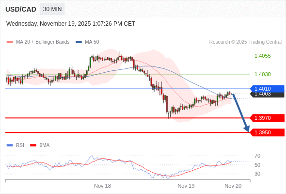 在 1.4010 之下,看跌,目标价位为 1.3970 ,然后为 1.3950 。