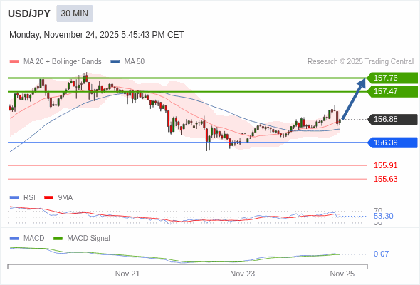 美元/日元 当日内 : 看涨,当 156.39 为支撑位。