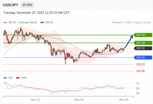 在 156.50 之上,看涨,目标价位为 157.15 ,然后为 157.50 。