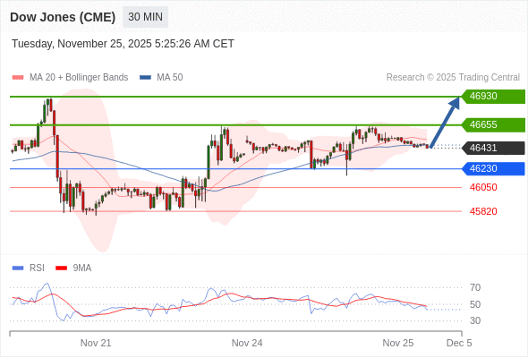 在 46230 之上,看涨,目标价位为 46655 ,然后为 46930 。
