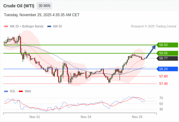 在 58.20 之上,看涨,目标价位为 59.05 ,然后为 59.50 。