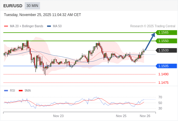在 1.1505 之上,看涨,目标价位为 1.1550 ,然后为 1.1565 。