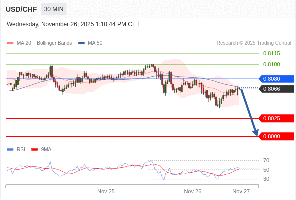 在 0.8080 之下,看跌,目标价位为 0.8025 ,然后为 0.8000 。