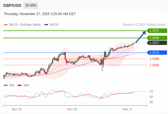 在 1.3210 之上,看涨,目标价位为 1.3280 ,然后为 1.3315 。