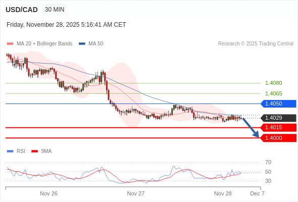 美元/加元 当日内: 期待1.4015。