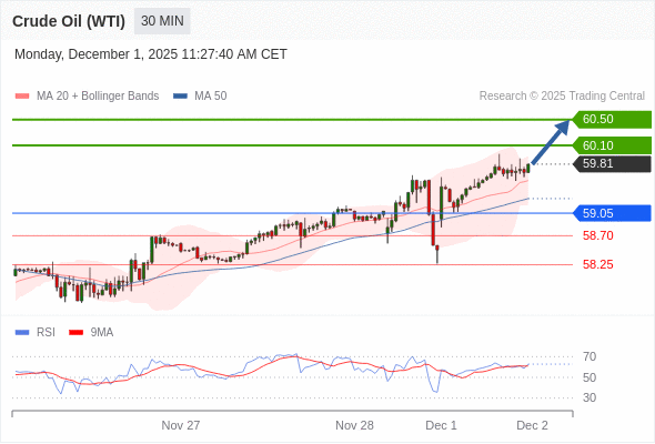 在 59.05 之上,看涨,目标价位为 60.10 ,然后为 60.50 。