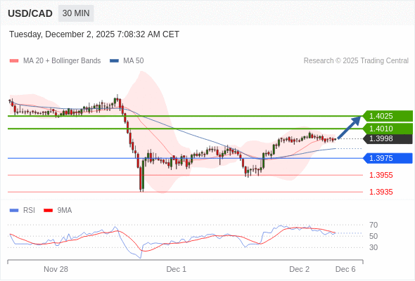 在 1.3960 之上,看涨,目标价位为 1.4010 ,然后为 1.4025 。