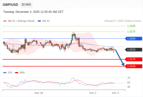 在 1.3250 之下,看跌,目标价位为 1.3175 ,然后为 1.3150 。