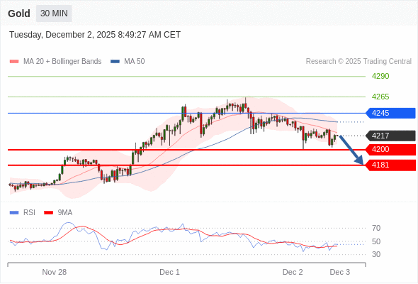 在 4245 之下,看跌,目标价位为 4200 ,然后为 4181 。