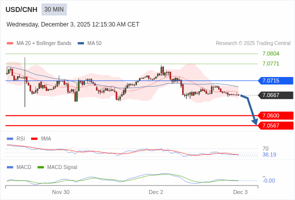 美元/人民币 当日内 : 看跌,在 7.0715 之下。