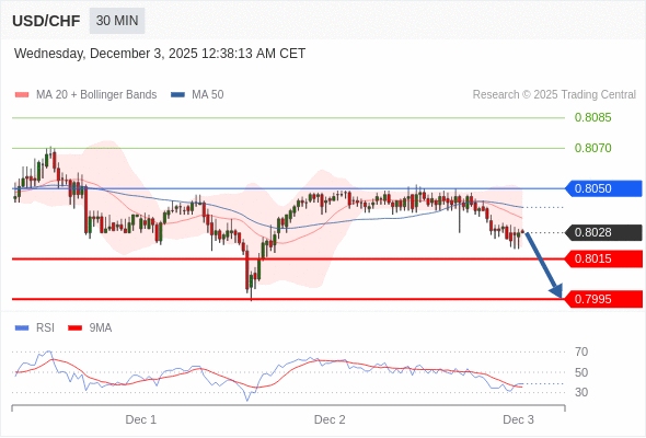 在 0.8050 之下,看跌,目标价位为 0.8015 ,然后为 0.7995 。