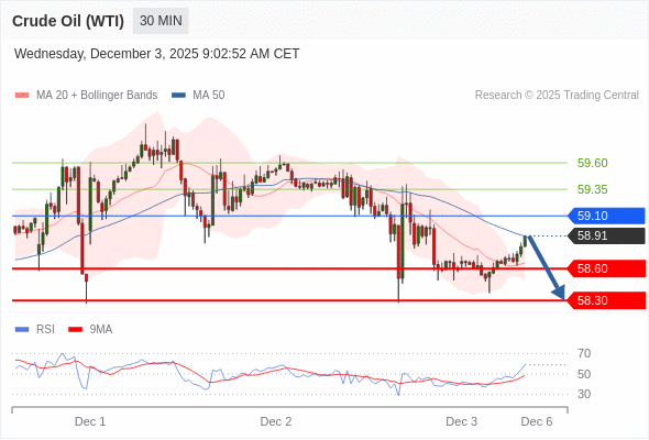 在 59.10 之下,看跌,目标价位为 58.60 ,然后为 58.30 。