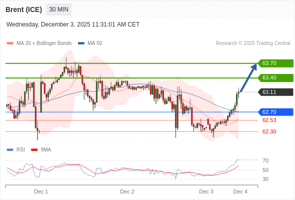 在 62.70 之上,看涨,目标价位为 63.40 ,然后为 63.70 。