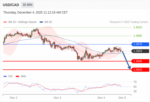 在 1.3975 之下,看跌,目标价位为 1.3935 ,然后为 1.3915 。