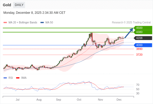 在 4000 之上,看涨,目标价位为 4380 ,然后为 4500 。
