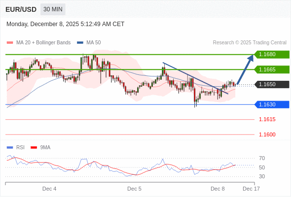 在 1.1630 之上,看涨,目标价位为 1.1665 ,然后为 1.1680 。