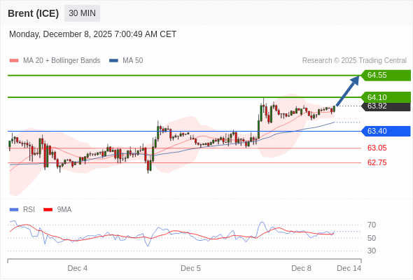 在 63.40 之上,看涨,目标价位为 64.10 ,然后为 64.55 。