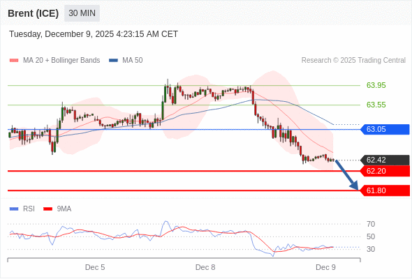 在 63.05 之下,看跌,目标价位为 62.20 ,然后为 61.80 。