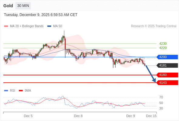 在 4200 之下,看跌,目标价位为 4160 ,然后为 4143 。