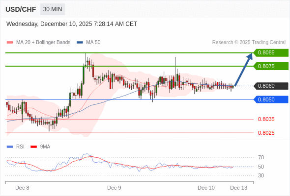 在 0.8050 之上,看涨,目标价位为 0.8075 ,然后为 0.8085 。