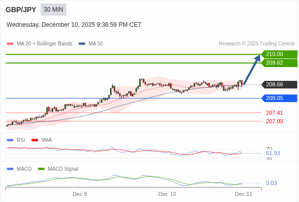 英镑/日元 当日内 : 看涨,当 208.05 为支撑位。