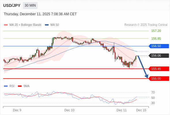 在 156.50 之下,看跌,目标价位为 155.45 ,然后为 155.00 。