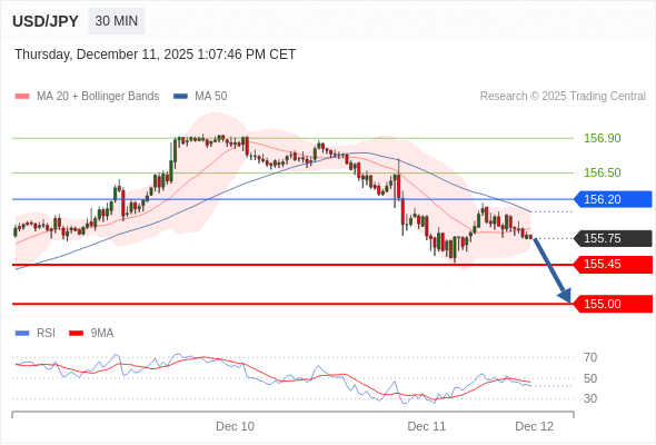 在 156.20 之下,看跌,目标价位为 155.45 ,然后为 155.00 。