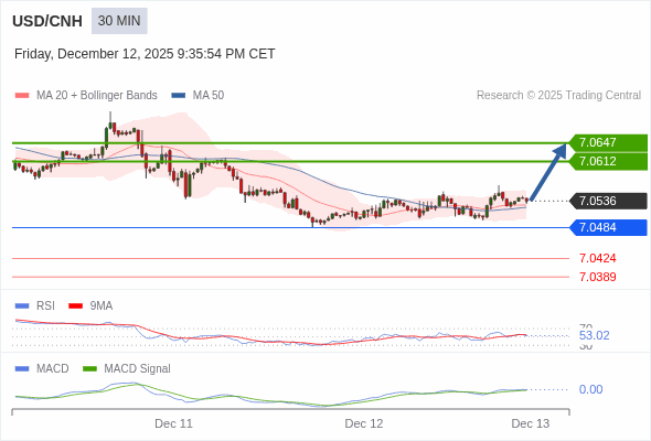 美元/人民币 当日内 : 看涨,当 7.0484 为支撑位。