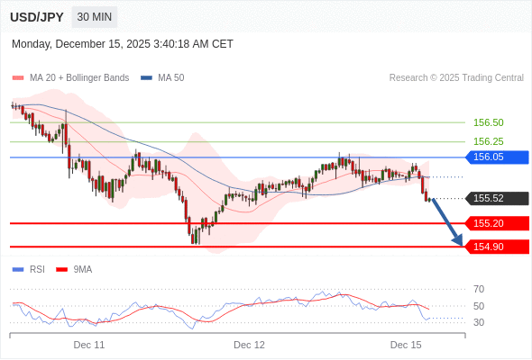 在 156.05 之下,看跌,目标价位为 155.20 ,然后为 154.90 。