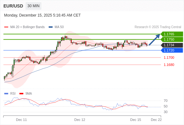 欧元/美元 当日内: 在1.1720之上,看涨。