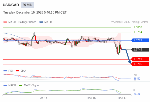美元/加元 当日内 : 看跌,在 1.3772 之下。