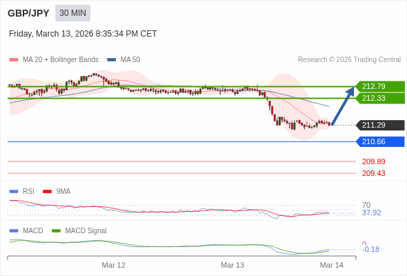 英镑/日元 当日内 : 有上涨的可能,目标价位定在 212.79 。