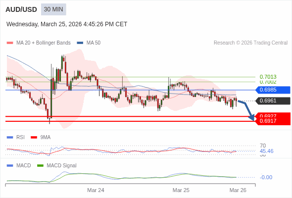 澳元/美元 当日内 : 看跌,在 0.6985 之下。