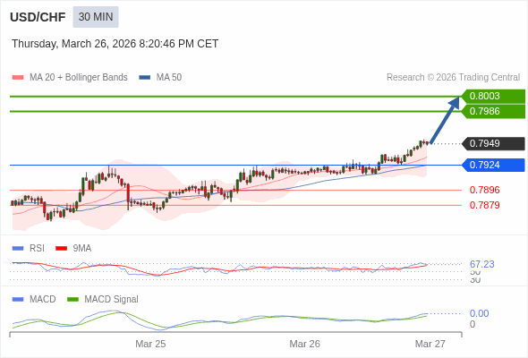 美元/瑞郎 当日内 : 看涨,当 0.7924 为支撑位。