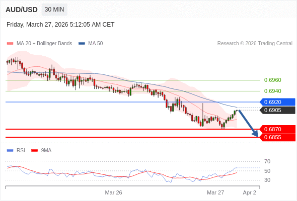 在 0.6920 之下,看跌,目标价位为 0.6870 ,然后为 0.6855 。