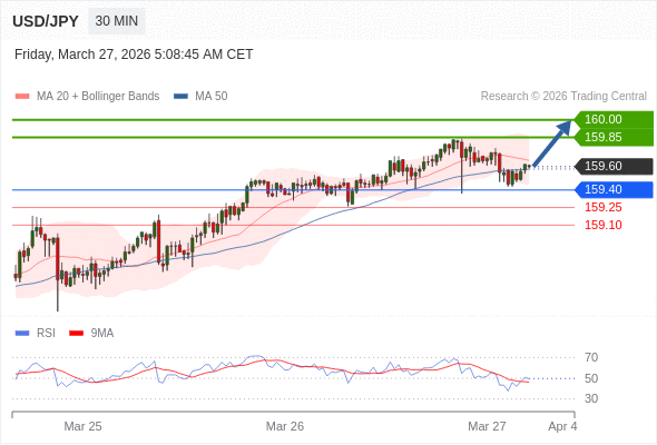 在 159.40 之上,看涨,目标价位为 159.85 ,然后为 160.00 。