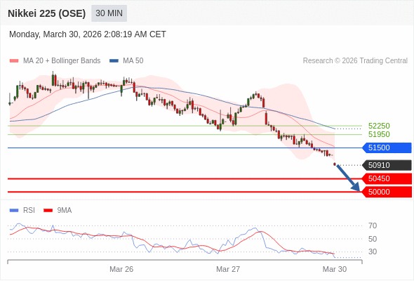 在 51500 之下,看跌,目标价位为 50450 ,然后为 50000 。