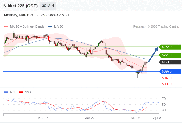 在 50970 之上,看涨,目标价位为 52250 ,然后为 52880 。