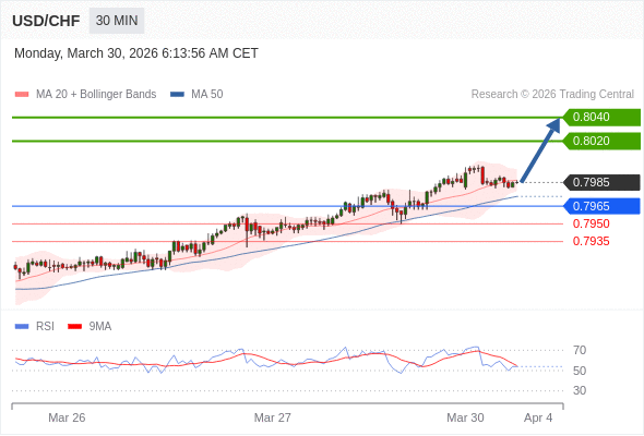 在 0.7965 之上,看涨,目标价位为 0.8020 ,然后为 0.8040 。