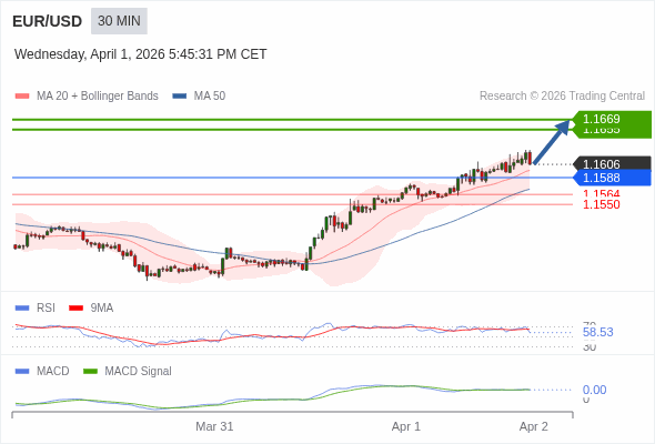 欧元/美元 当日内 : 看涨,当 1.1588 为支撑位,目标定在1.1669。