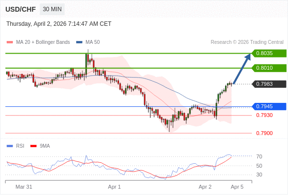 在 0.7945 之上,看涨,目标价位为 0.8010 ,然后为 0.8035 。