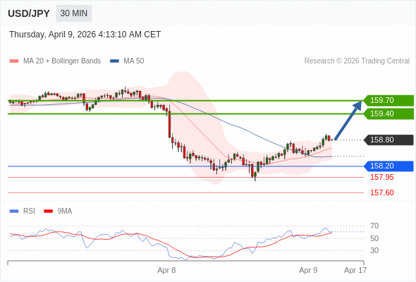 在 158.20 之上,看涨,目标价位为 159.40 ,然后为 159.70 。