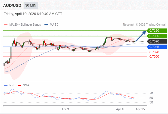 在 0.7045 之上,看涨,目标价位为 0.7095 ,然后为 0.7120 。