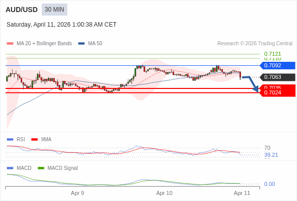 澳元/美元 当日内 : 看跌,当 0.7092 为阻力位。