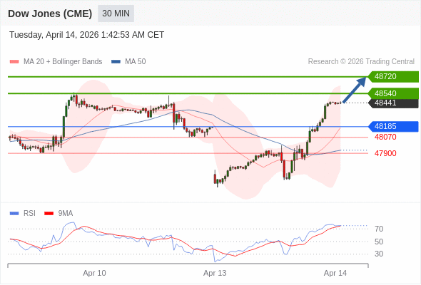 在 48185 之上,看涨,目标价位为 48540 ,然后为 48720 。