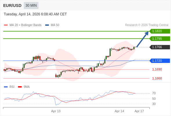 在 1.1720 之上,看涨,目标价位为 1.1795 ,然后为 1.1820 。
