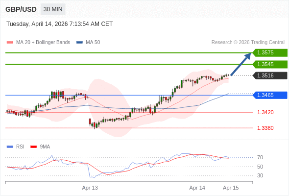 在 1.3465 之上,看涨,目标价位为 1.3545 ,然后为 1.3575 。
