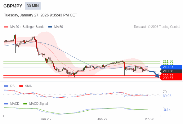 英镑/日元 当日内 : 看跌,在 210.87 之下。